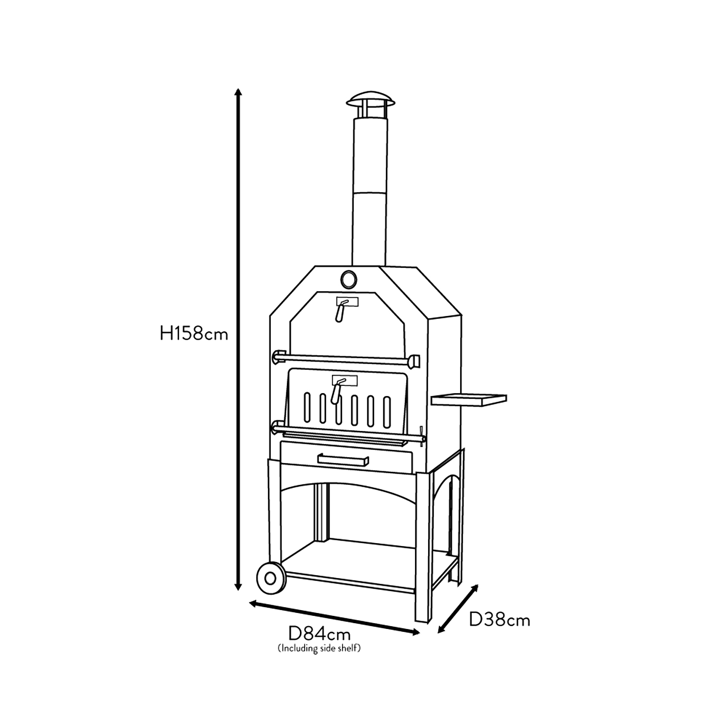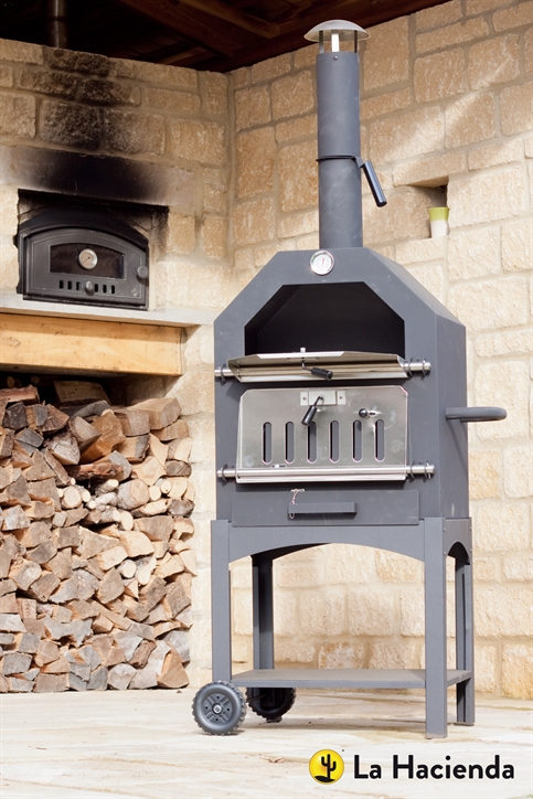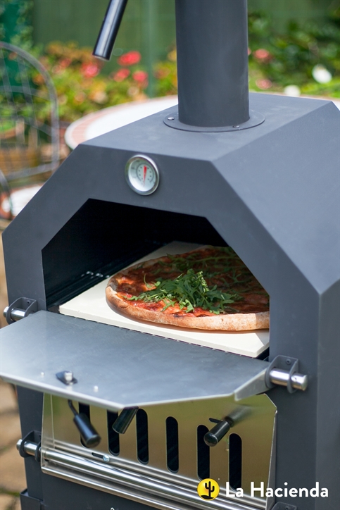 The La Hacienda Pizza Oven BBQ is made of 2 mm thick steel and features a black heat-resistant coating. This means that the pizza oven can stay outside on your patio. With practical handles and wheels, the pizza oven is a breeze to move. The tall chimney ensures that smoke disappears quickly so it doesn’t bother you.