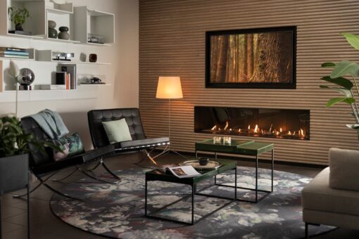 The standard version of the Trimline 170H Front has a burner bed made of wooden logs and a lamelas interior. It also has a double burner system. It comes with the Ecomax remote control and you can choose to add WiFi-control with our Trimline Fires app