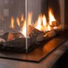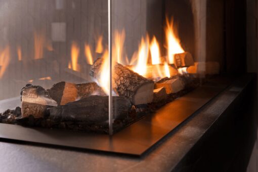 The standard version of this fireplace has a burner bed made of wooden logs and is equipped with a double burner.